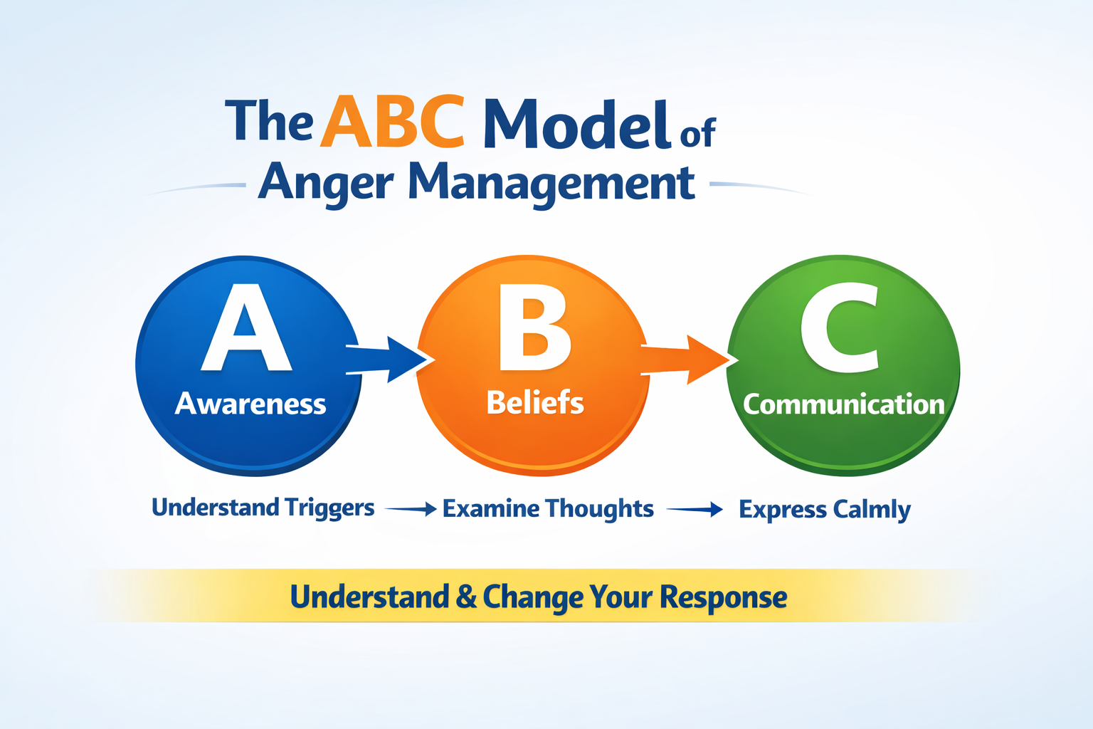 The ABC model of anger management works the same way. It's a simple, easy-to-remember three-step model that will help you control your anger, master your emotions and create calmer, happier and more respectful relationships.